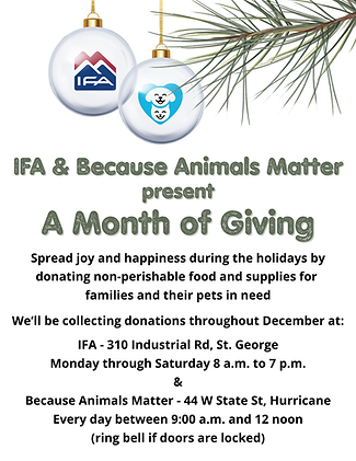 IFA and BAM have partnered for a Month of Giving. We are collecting non perishable food and supplies for families and their pets.